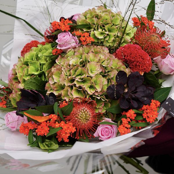 Haal de warme sfeer van de herfst in huis met het Luxe Herfst Hortensia Boeket. Een rijk en weelderig boeket vol prachtige hortensia's, gecombineerd met andere seizoensbloemen in diepe, warme tinten. Perfect als eyecatcher op tafel of als luxe cadeau voor een bijzonder moment.
