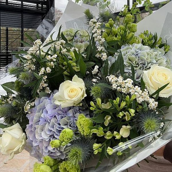 Laat je betoveren door de serene schoonheid van ons Tof Baby Blue Boeket. Dit stijlvolle arrangement combineert babyblauwe, witte en frisgroene bloemen tot een harmonieuze samenstelling vol rust en verfijning. De zachte tinten brengen een kalme en romantische sfeer in huis - perfect als geschenk bij een geboorte, jubileum of gewoon om jezelf te verwennen.